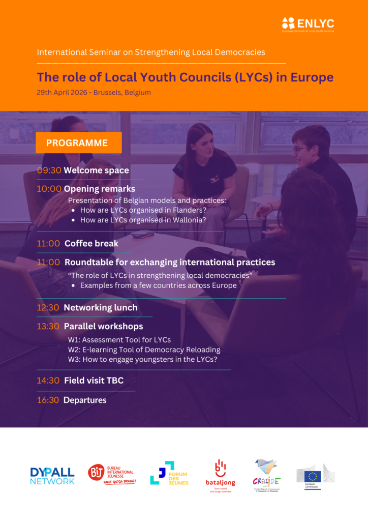 Dans le cadre de notre collaboration avec DYPALL Network, nous recherchons des animateur.rice.s d’un Conseil Communal des Jeunes (CCJ) qui seraient intéressé.e.s de participer à une journée d’échanges autour de la thématique suivante : le rôle des Conseils Communaux de Jeunes en Europe